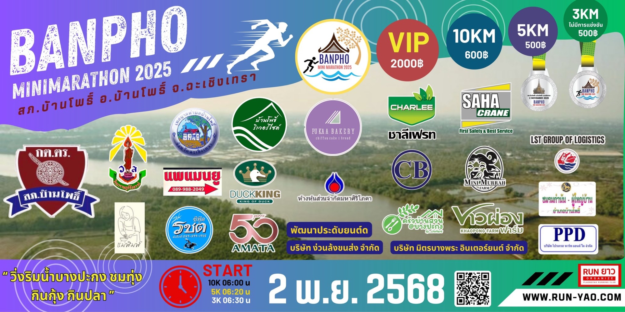 สอบถามข้อมูลเพิ่มเติมเกี่ยวกับรายการวิ่ง BANPHO MINI MARATHON#1 2025 Mobile : 0818614273จัดโดย : Run ยาว Organize