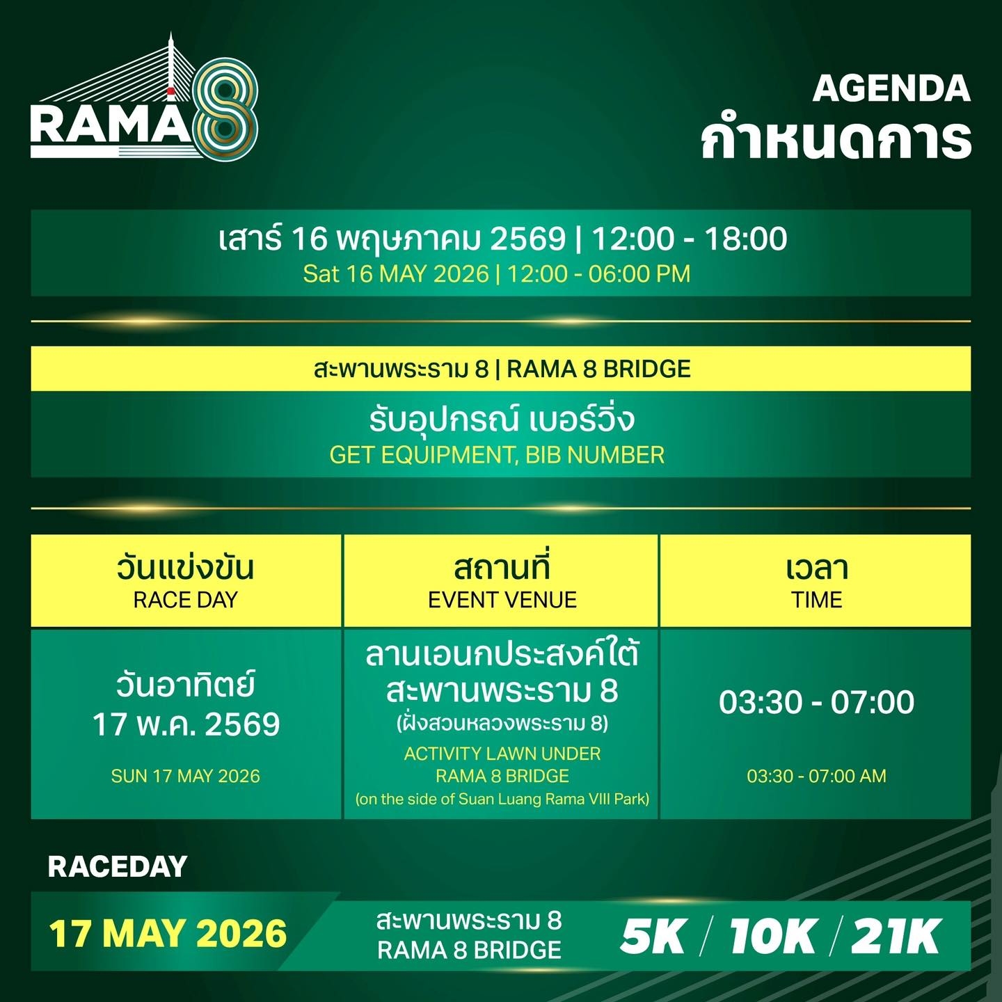 งานวิ่ง Rama 8 Run คือหนึ่งในงานวิ่งที่เป็นเอกลักษณ์ของกรุงเทพมหานคร ณ สะพานพระราม 8 แลนด์มาร์กสำคัญริมแม่น้ำเจ้าพระยา ด้วยสถาปัตยกรรมที่สง่างามและทัศนียภาพอันสวยงามของเมืองหลวงในยามรุ่งอรุณ นักวิ่งทุกท่านจะได้สัมผัสบรรยากาศการวิ่งบนสะพานข้ามแม่น้ำที่เต็มไปด้วยเสน่ห์ ได้ชมวิวพระอาทิตย์ขึ้นเหนือลำน้ำเจ้าพระยา เส้นทางการวิ่งเชื่อมโยงระหว่างเมืองเก่าและเมืองใหม่ของกรุงเทพฯ ผ่านย่านวัดวาอารามเก่าแก่ ศิลปะ วัฒนธรรม และวิถีชีวิตของชุมชนริมฝั่งน้ำอย่างมีเสน่ห์ไม่เสื่อมคลาย