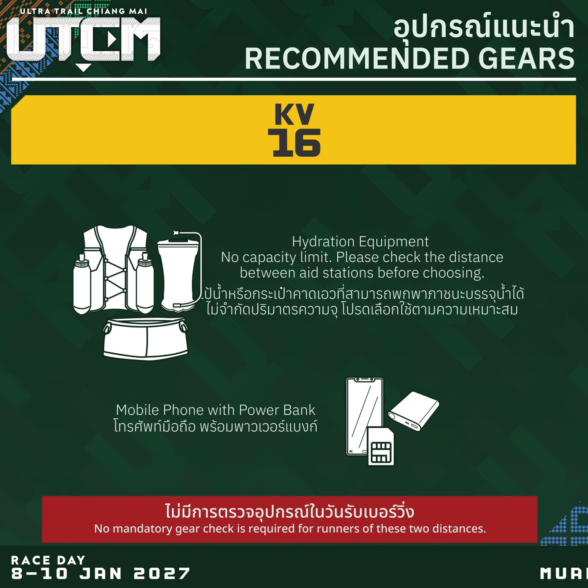ขอความกรุณาผู้เข้าแข่งขันทุกท่าน เตรียมและพกพาอุปกรณ์บังคับให้ครบถ้วนตลอดเส้นทางการแข่งขัน