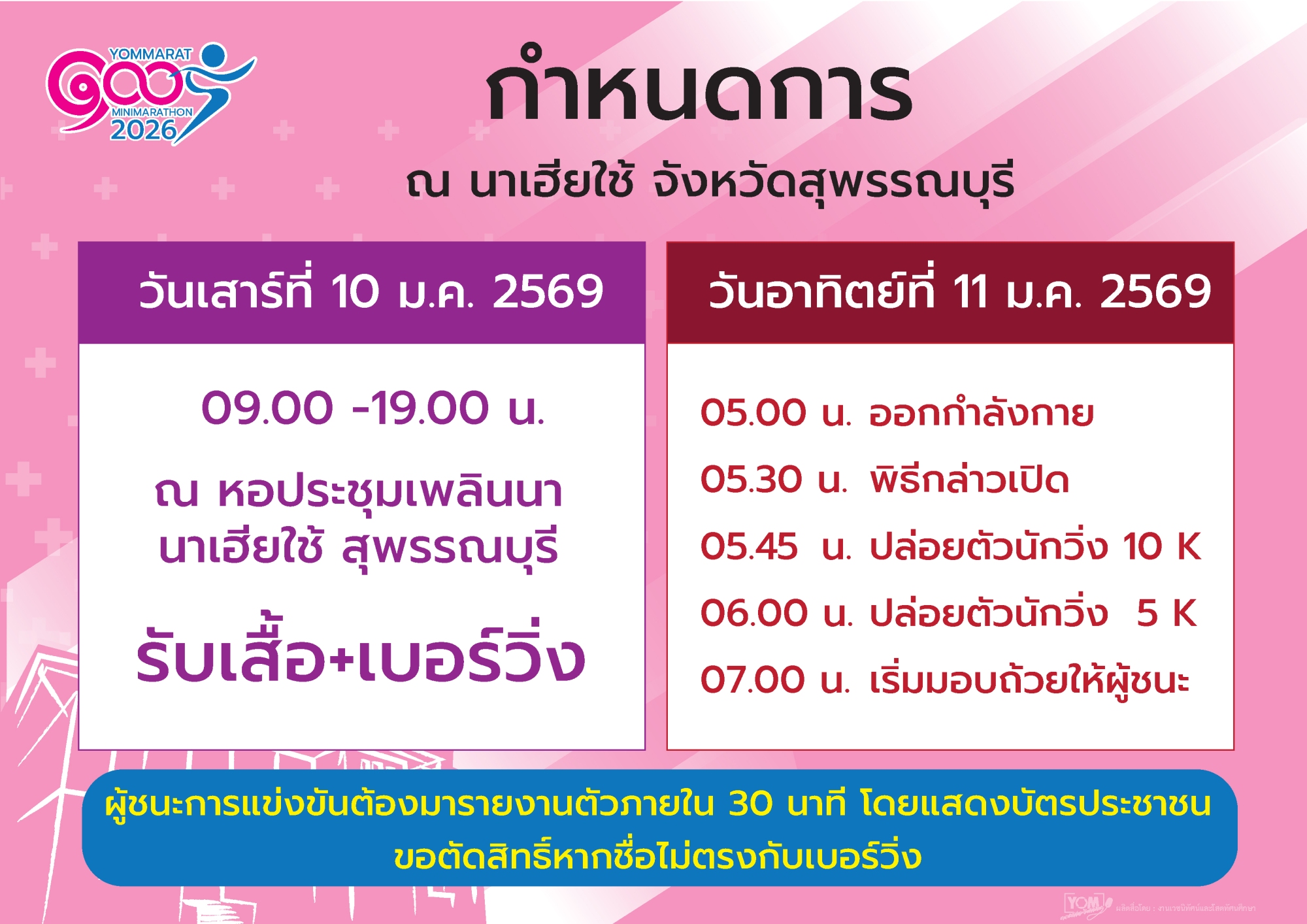 ทั้งนี้หากเกิดเหตุการณ์ที่ไม่คาดคิด หรือภัยพิบัติทางธรรมชาติที่ไม่สามารถควบคุมได้ เช่น สถานการณ์ CIVID-19 ทางผู้จัดขอสงวนสิทธิ์ในการไม่คืนเงินผู้สมัครในกรณีดังกล่าว โดยจะเลื่อนวันแข่งขันตามความเหมาะสมของสถานการณ์